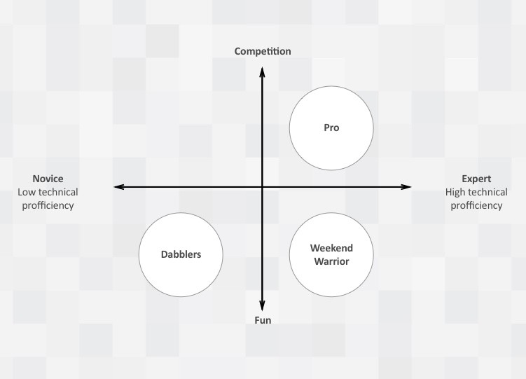 Each observed user type occupies a different quadrant of our matrix and each has different characteristics. If we take a deeper look at our Dabblers we can theorise that their key characteristics are that they have poor technical skills, are risk-averse, only use areas of the bike park with which they are familiar and experience frequent gear failure. By identifying these characteristics we can create new products, services and experiences to meet their needs.